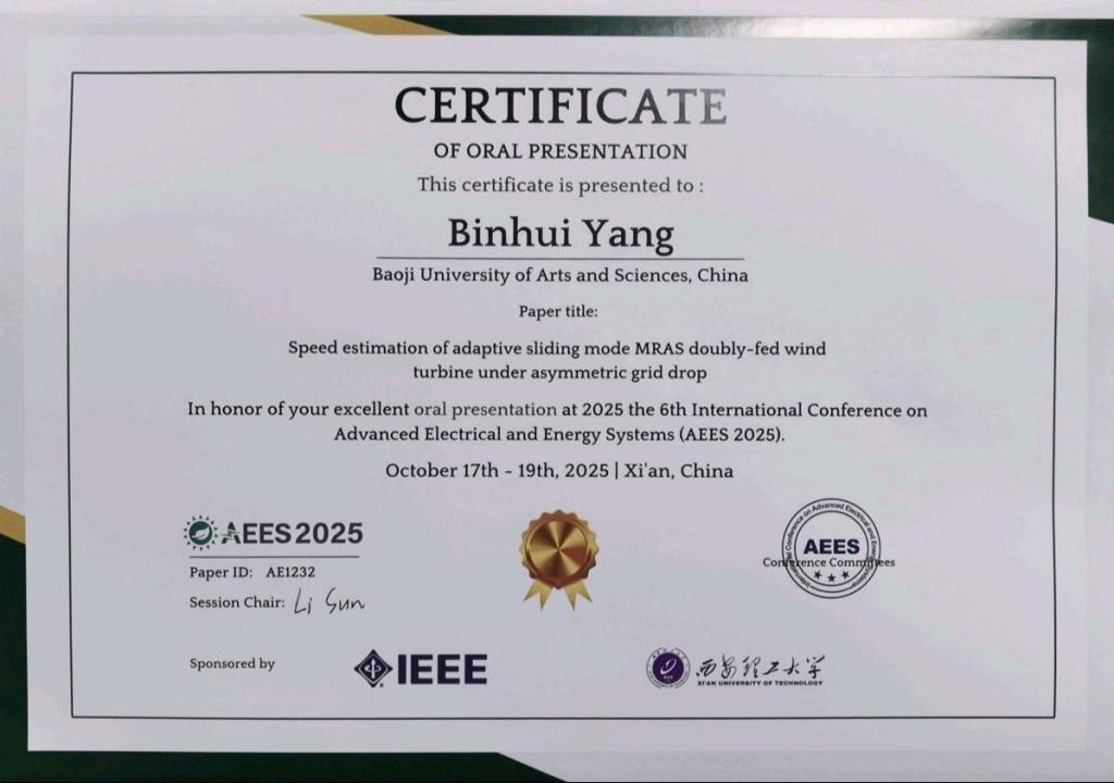 张文娟教授指导的研究生杨博宇、杨秉辉提交的论文《Speed estimation of adaptive sliding mode MRAS doubly-fed wind turbine under asymmetric grid drop》,经专家严格初审与复审后,成功入选AEES会议报告。杨秉辉在小组发言环节中,清晰阐述了研究成果的核心内容与创新点,并与会议专家展开深入交流研讨,充分展现了我们研究生在学术研究中的创新能力与实践水平。
